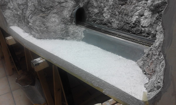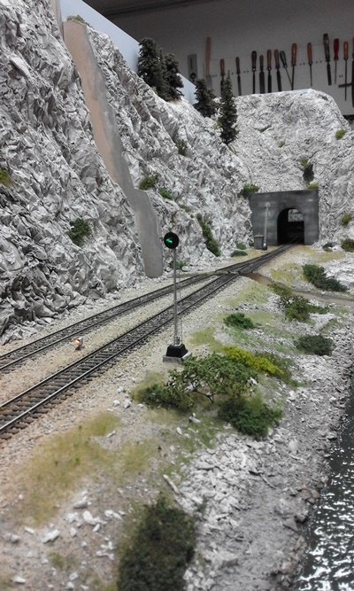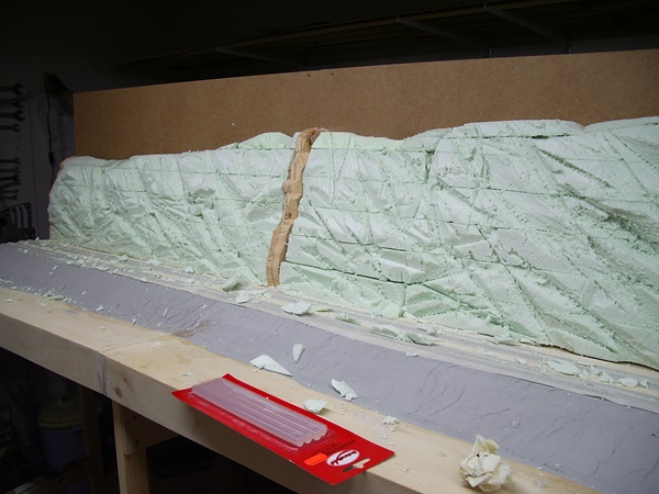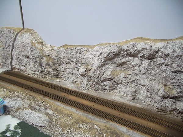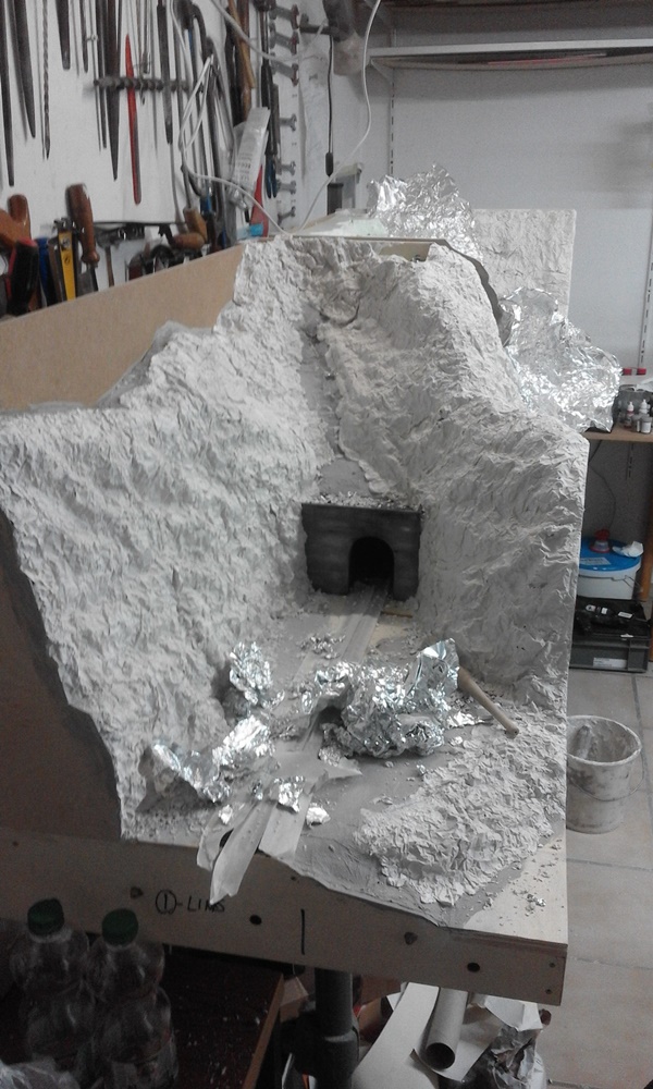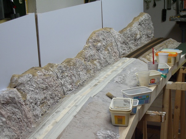 Für die Felsen wurde Füllspachten verwendet, die Gestaltung erfolgte mit der Alufolienmethode, ggf. werden die Felsen später