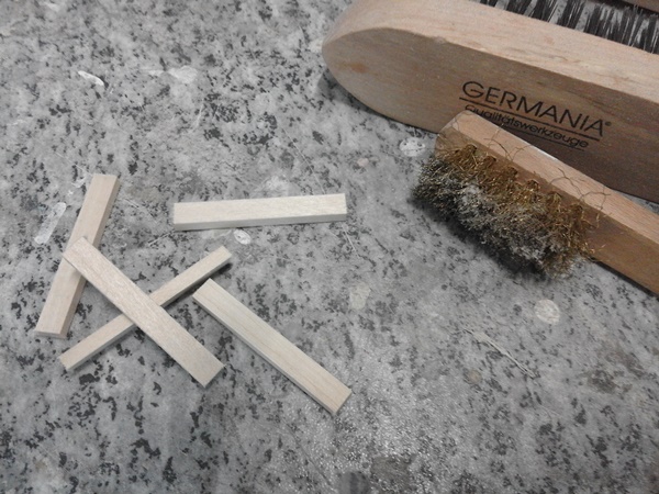 Länge gesägt mit Stahl- und Messingdrahtbürste behandelt. Dann mit Beize und einem braunen Wash behandelt.
