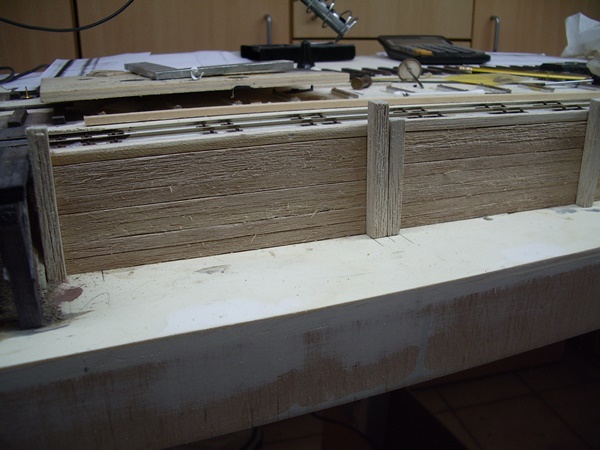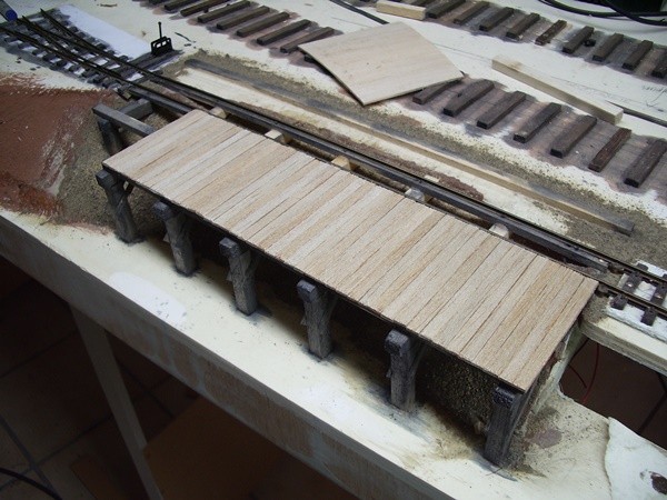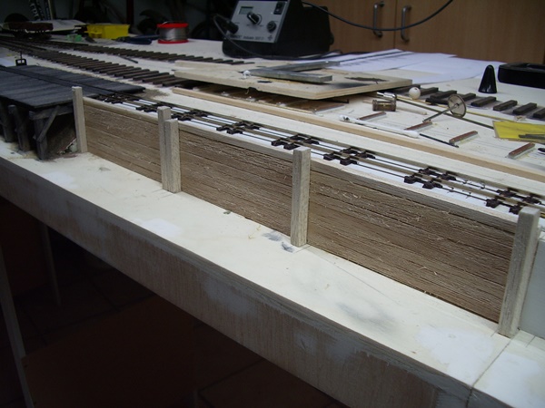 Pfahlstrecke gebaut, mit einer Holzplattform. Mit der Kaimauer aus Balsaholz habe ich angefangen...
