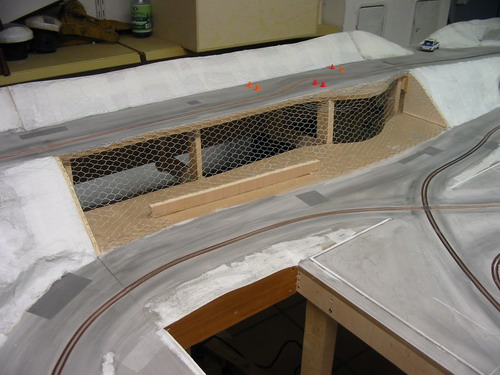 Mit dem Landschaftsbau ging es weiter, bis auf ein kleines Stück ist alles fertig beklebt mit einem Überzug aus Küchenrollenpapier...demnächst geht es weiter mit der Felsgestaltung und Begrünung...