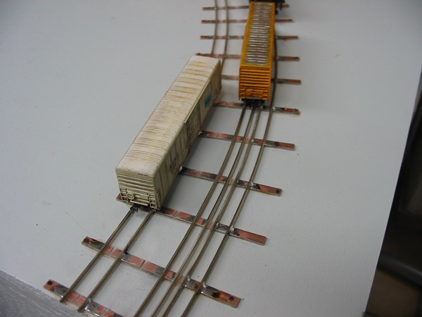 durch auflöten von Schienenprofilen auf Pertinaxschwellen. Das Gleis lässt sich dadurch sehr gut ausrichten und